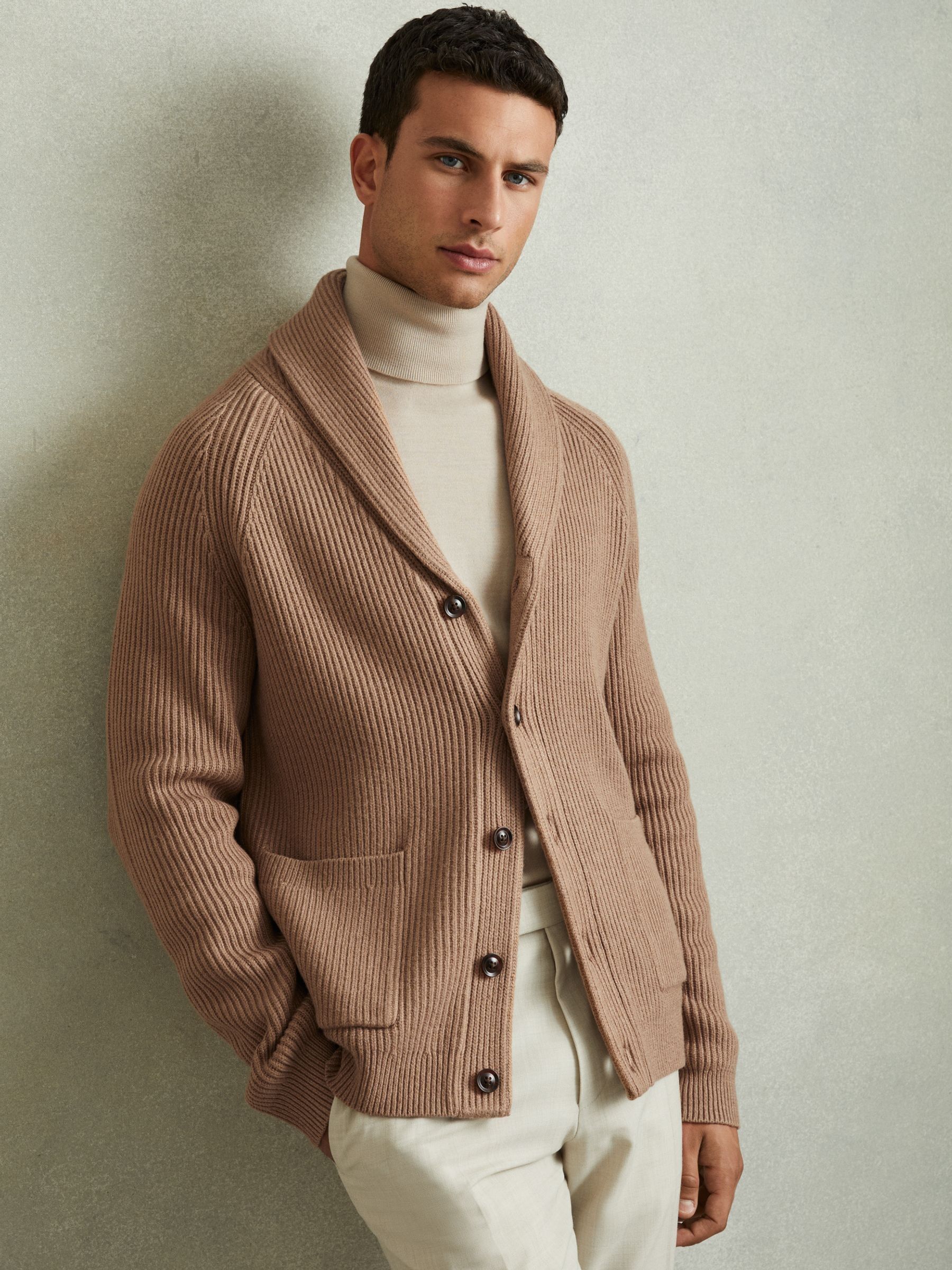 Gerippte Strickjacke mit Schalkragen aus Baumwolle und Wolle in Kamelbraun