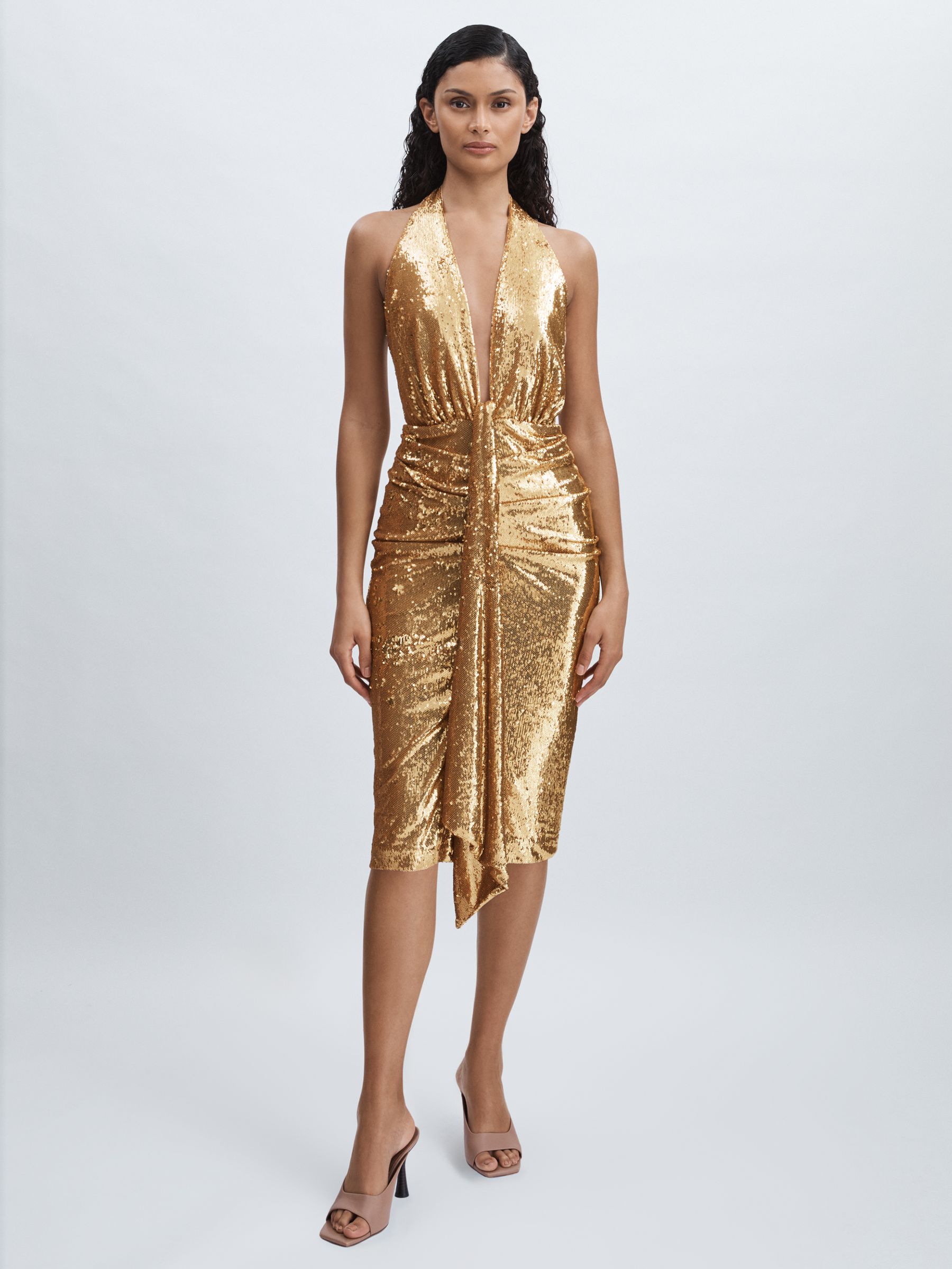 Halston Gold Sequin Halterneck Plunge Dress in Gold