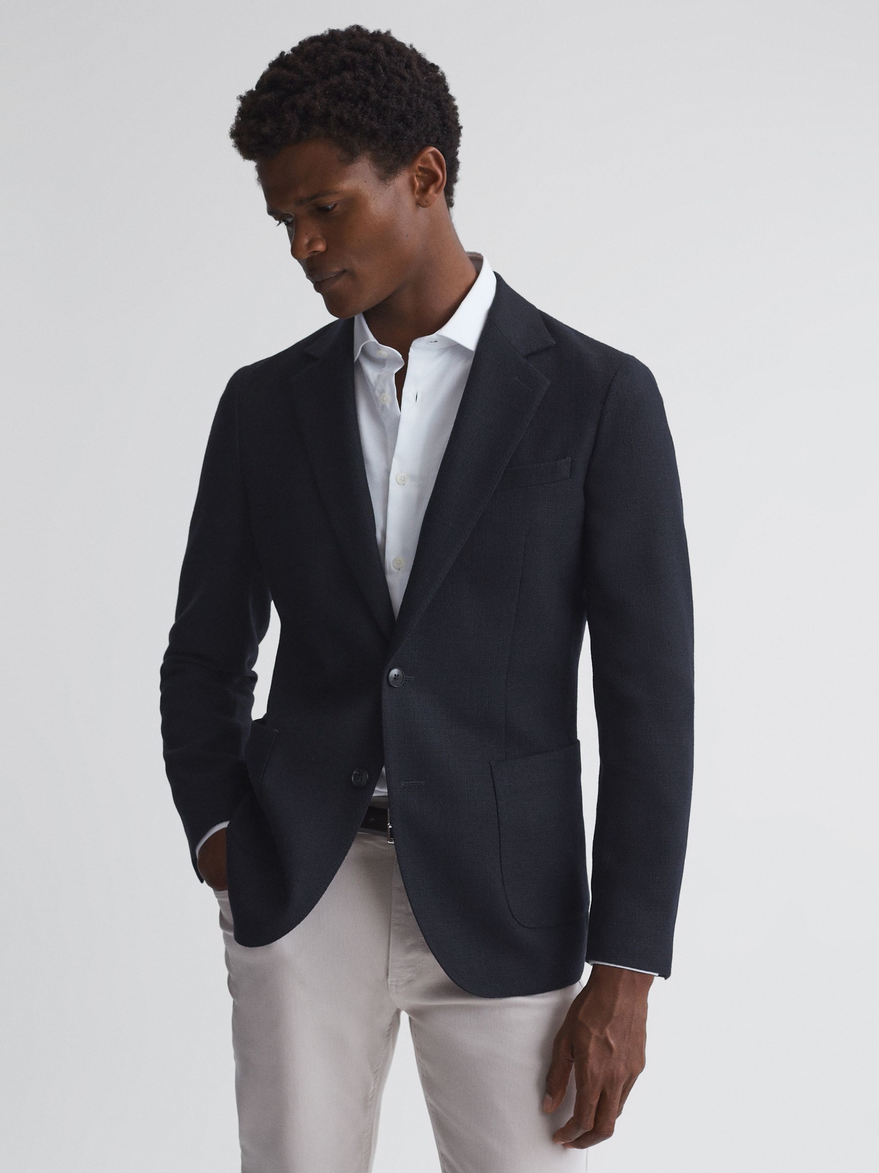 Slim Fit Textured Wool Blend Blazer in Navy