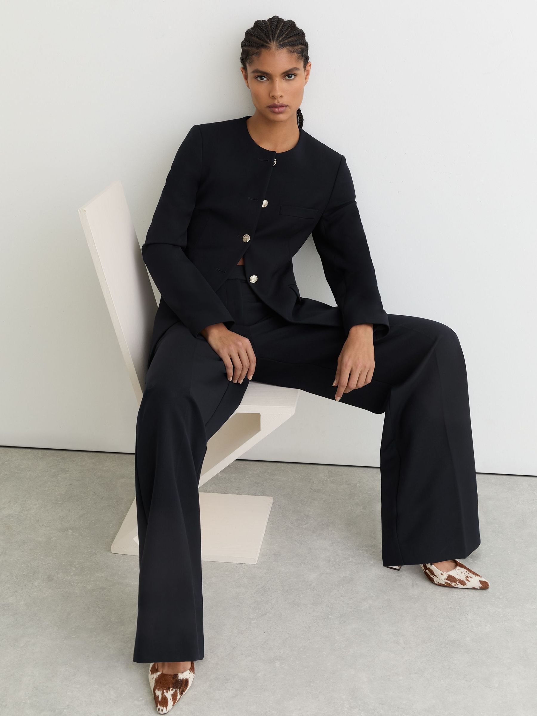 Collarless Button-Through Fitted Jacket in Navy