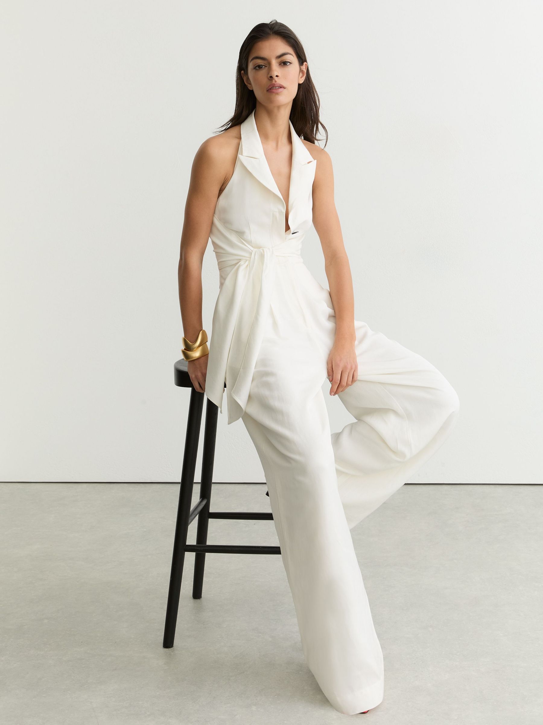 Petite Sheer-Panel Wide-Leg Belted Jumpsuit in Ivory