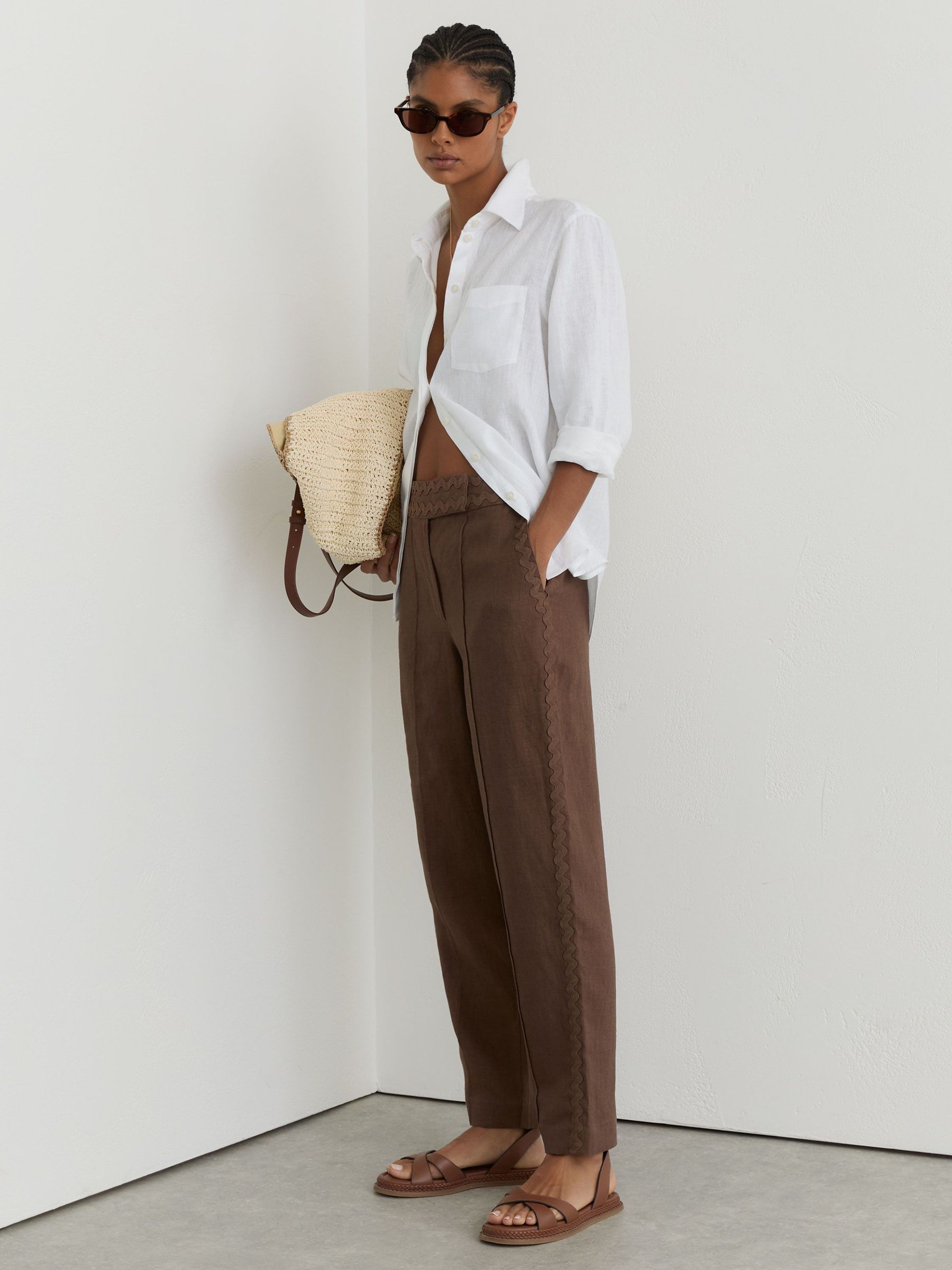 Petite Linen Wave-Trim Tapered Trousers in Brown